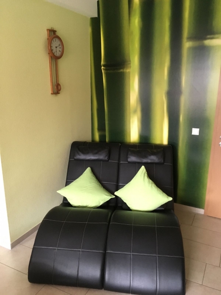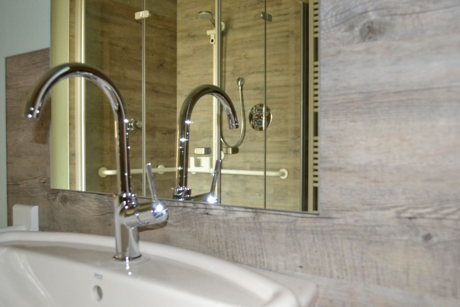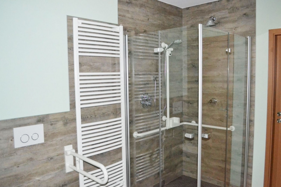 Weiterhin befinden sich Im unteren Bereich ein seniorengerechtes Schlafzimmer (Doppelbett mit einer Sitzhöhe von 60cm), ein behindertengerechtes Badezimmer und der Wellnessraum bzw. Schlafzimmer 6.